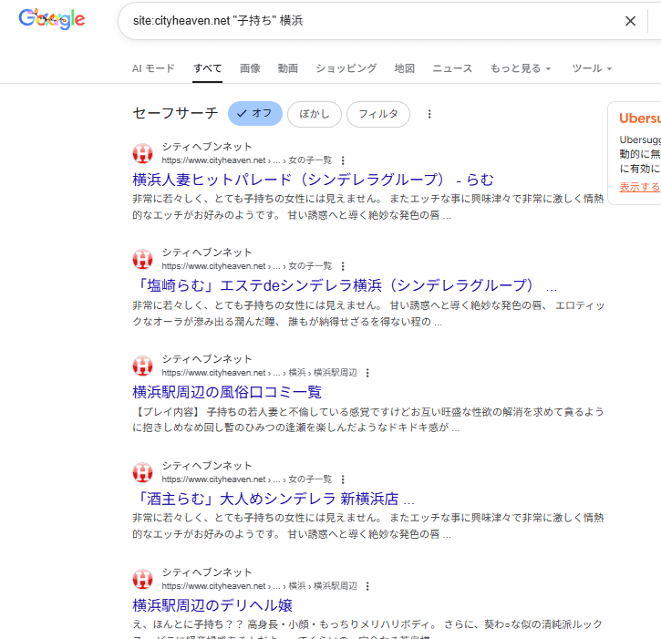 そして、検索をすると次のようにシティヘブンネットに掲載された横浜エリアで遊べる子持ち風俗嬢の情報がズラッと出てきます。
