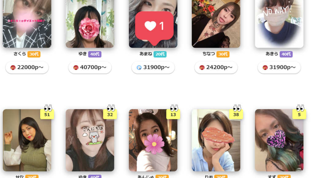 試しに、#小さい子供いますなどのハッシュタグで検索をすると、次のように女性の顔写真がズラッと表示されます。