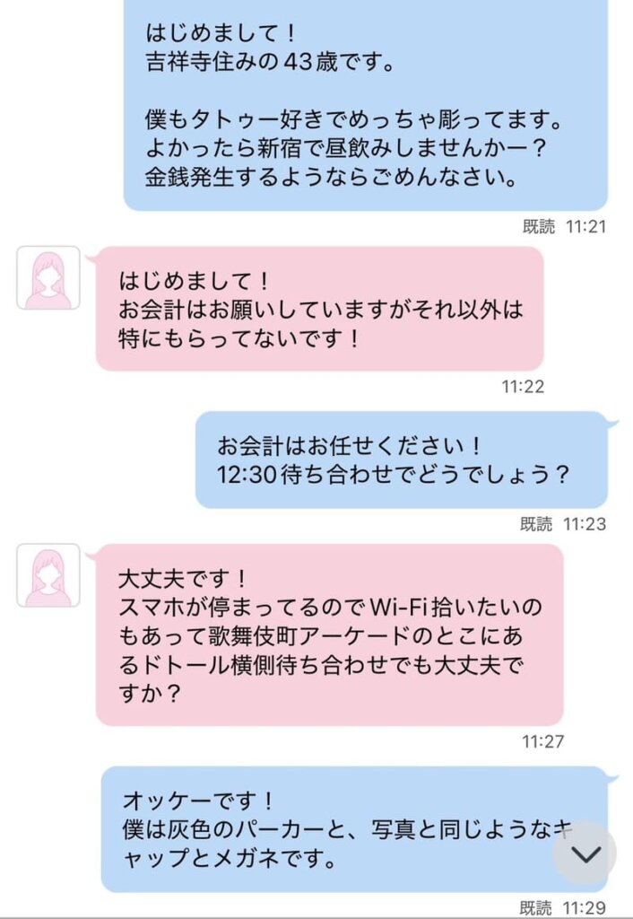 上の画像は、「新宿で昼飲み」との募集をかけていた女性に、実際に会ったときのやりとりです。