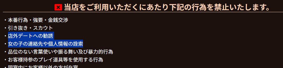 じっさい、全国に無数に存在するどの風俗店のホームページを見渡してみても、次のように店外デートや連絡先交換は禁じられています。